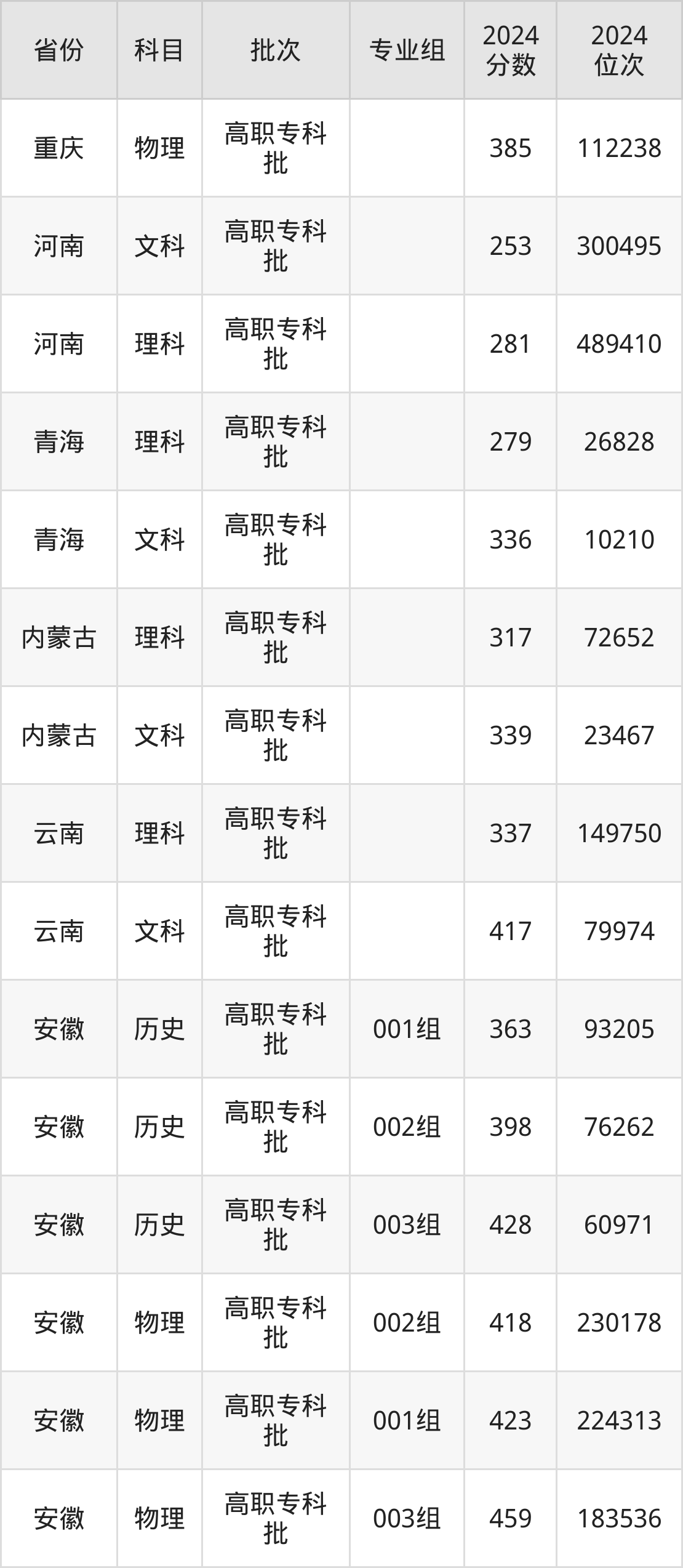 郑州澍青医学高等专科学校002组:2024年投档录取最低分为418分,录取最低位次为230178名。