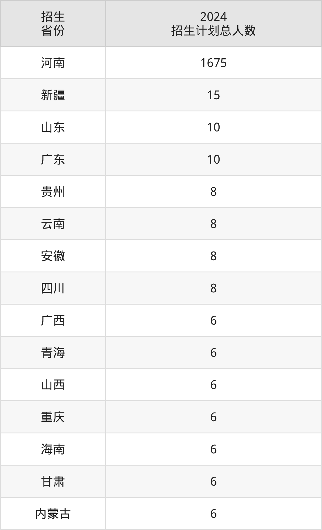 2024年郑州健康学院面向全国15个省市开展本科招生;招生专业共30个,招生人数共1784人。2024年在河南省招生计划总人数是1675人,其中,郑州健康学院在河南省招生人数最多的是护理。郑州健康学院在各省具体招生人数情况如下表。