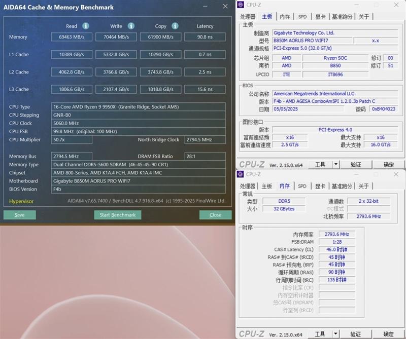 在默认设置下,ddr5内存工作频率为5600mhz,内存读取、写入和拷贝速度分别是69453mb/s、70464mb/s和61900mb/s,延迟为90.8ns。