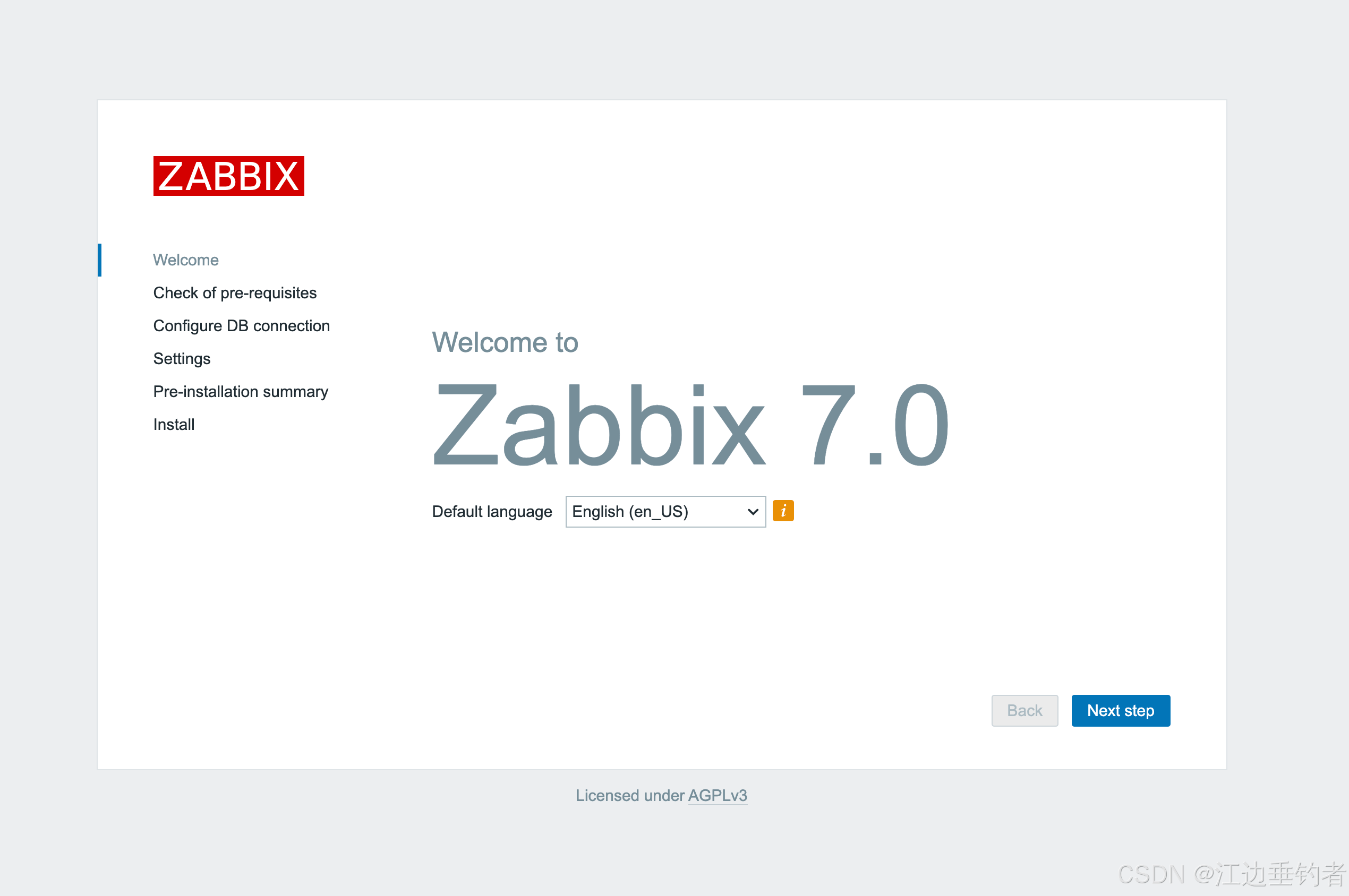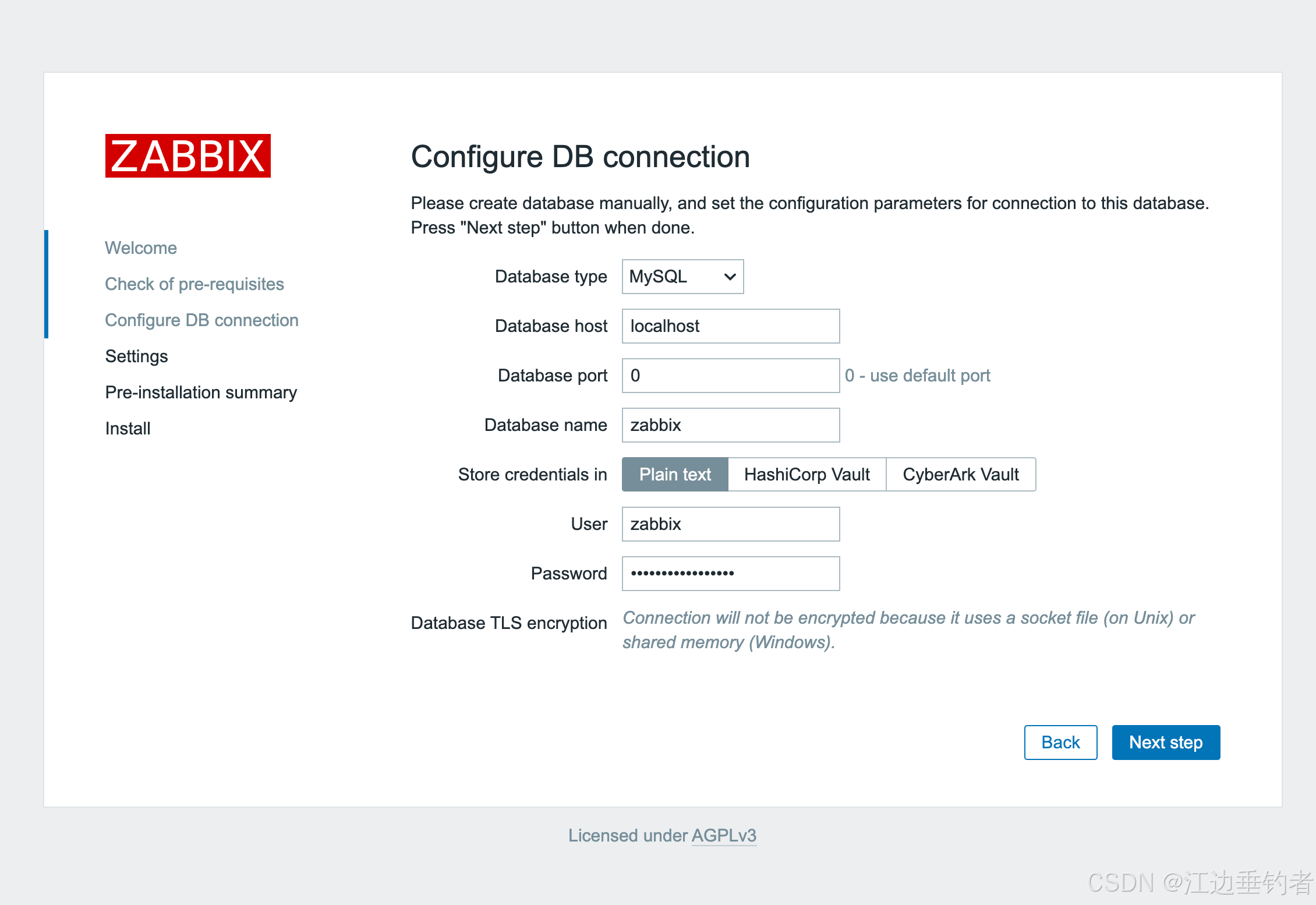 http://<zabbix-server-ip>/zabbix。 - 按照向导操作: