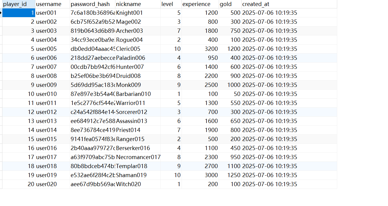 insert into players (username, password_hash, nickname, level, experience, gold) values