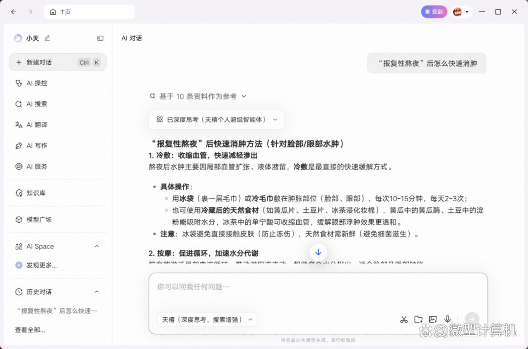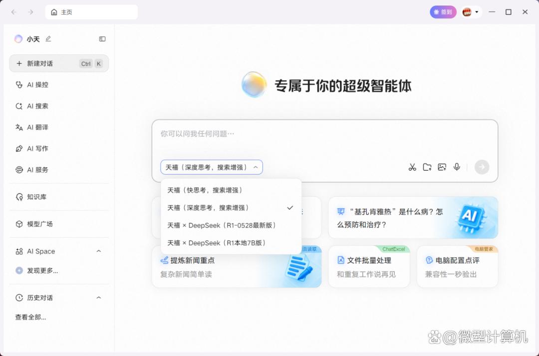 联想小天支持常规的在线问答,用户可以选择使用天禧、豆包或者deepseek合作的在线大模型,也可以在断网环境使用内置的deepseek-r1 7b大模型。