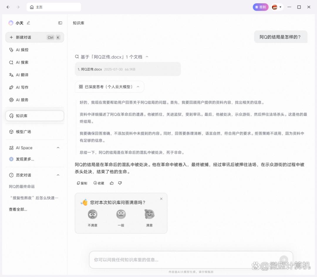 联想小天还支持搭建个人知识库,用户只需要把个人文档放在知识库中,就能通过大模型来便捷地管理知识库内容。值得一提的是,联想小天提供了本地知识库和个人云知识库两种构建模式,其中本地知识库主要使用本地大模型,支持无网问答,安全性更好;而个人云知识库则是借助联想的个人云来搭建,文档全部存放在个人云上,能够使用云端算力管理知识库内容,联想也提供了全链路的tee加密保护。从我的使用经验来看,个人云知识库的体验更好,比如上传《阿q正传》小说之后,大模型能够根据内容轻松回答阿q的结局。