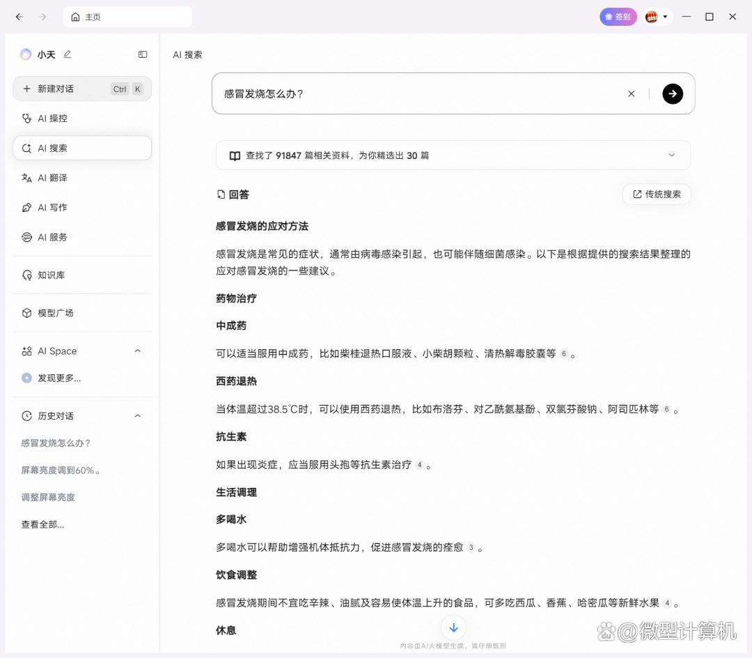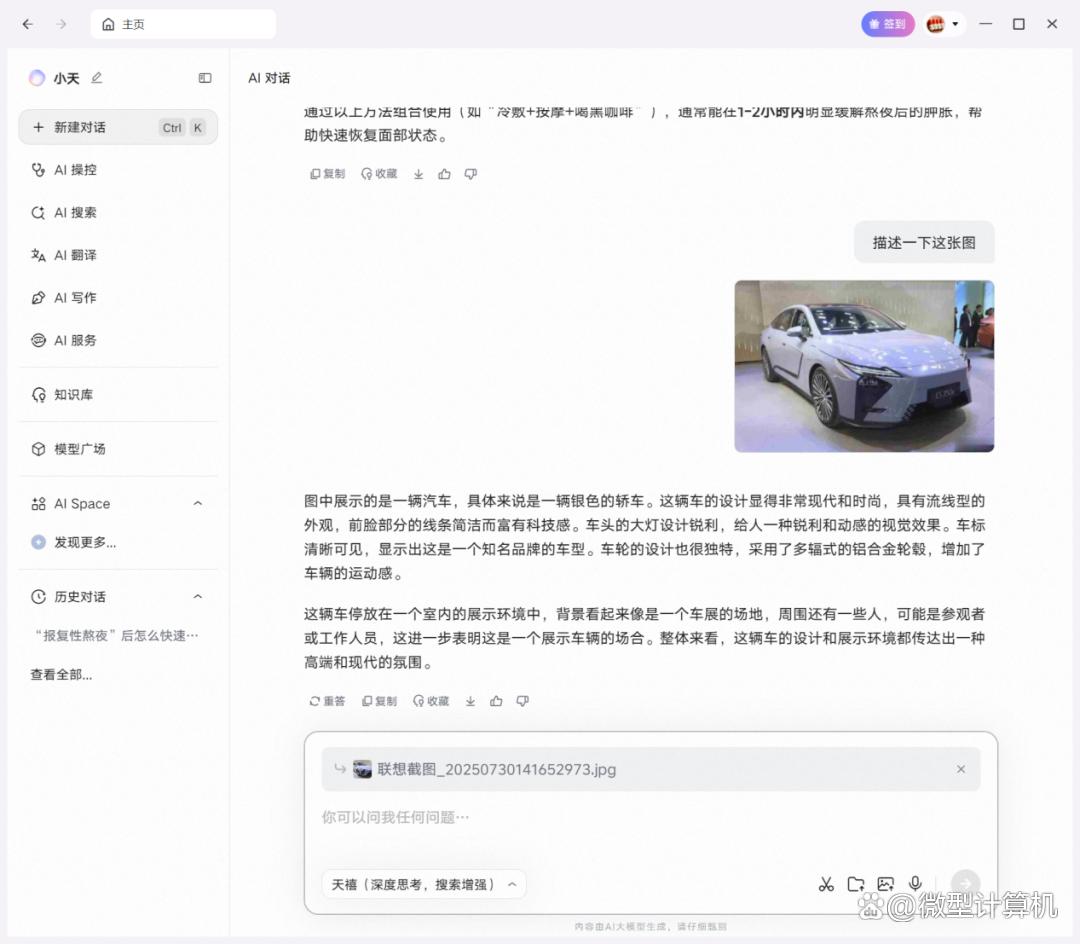 同时,联想小天还提供了ai搜索、ai操控、ai翻译、ai写作以及ai服务等更细分的ai功能,借助豆包、“满血版”deepseek-r1等在线大模型的能力,一步到位为用户提供便捷的ai使用体验,免去了打开第三方网址、注册登录以及输入提示词等麻烦。