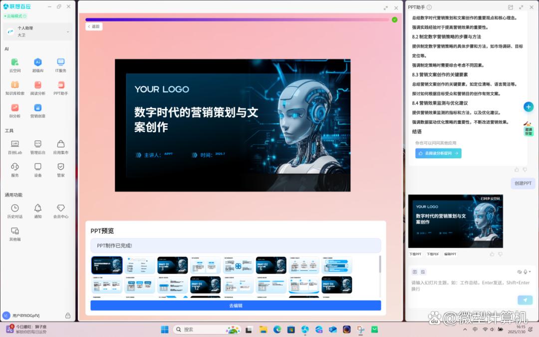 比如在《联想百应》的bi分析功能中,我们上传一份excel文档让ai自动求和,这台机器能够准确完成任务,甚至还会自动删掉多余的单元格,使用起来很方便。当然,用《联想百应》来生成ppt也很快——联想百应和aippt进行合作带来了ai生成ppt的功能。