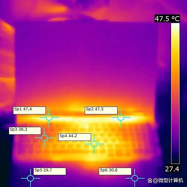 我们在26.5℃室温对这台机器进行双烤测试,实测烤机30分钟后,这台机器正面外表的最高温度为47.5℃,位于c面右侧转轴处,键盘中部区域的温度为44.2℃,wasd键位的温度为38.3℃,掌托位置的温度保持在30℃左右。