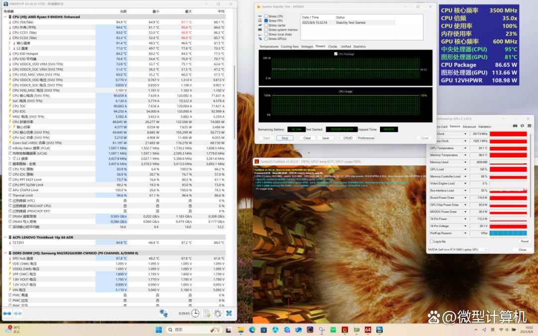 双烤30分钟后,这台机器的处理器封装功耗维持在86.65w,核心温度为91.4℃;gpu的功耗维持在113.66 w,温度为84.1℃。总体上看,这台机器在双烤30分钟后能够维持大约200w的性能释放水平,表现出色。