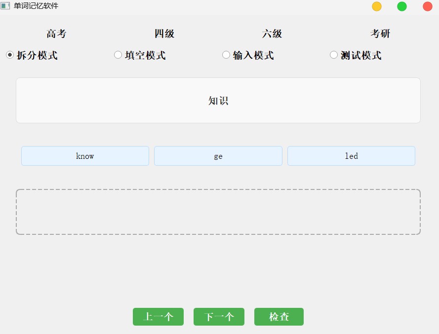 - 拆分模式再次点击已经被选择的单词片段可以取消锁定,但是要按单词拼写的倒序取消(原本是没锁定的,但是那样会导致一个字符可以重复点击,导致单词拼接不正确,而且还没法判断正误)。