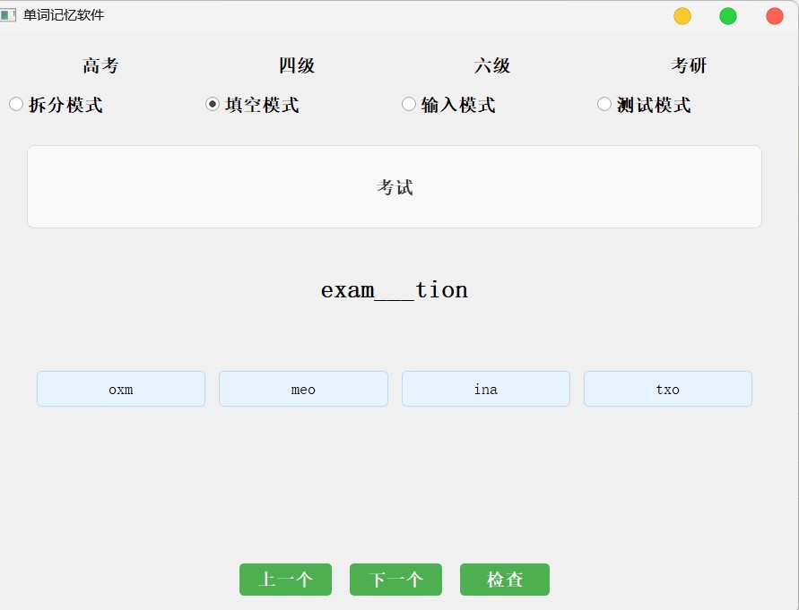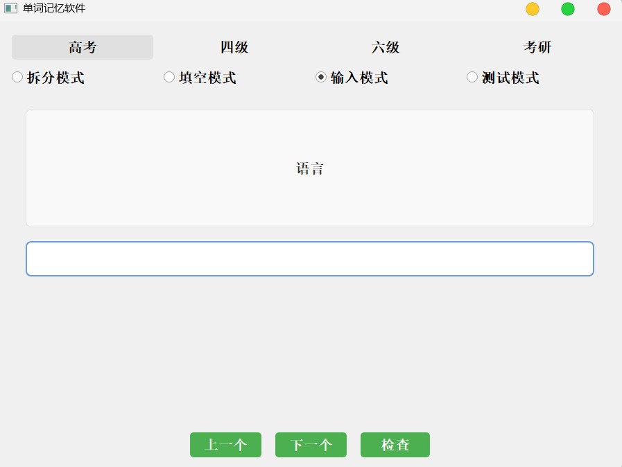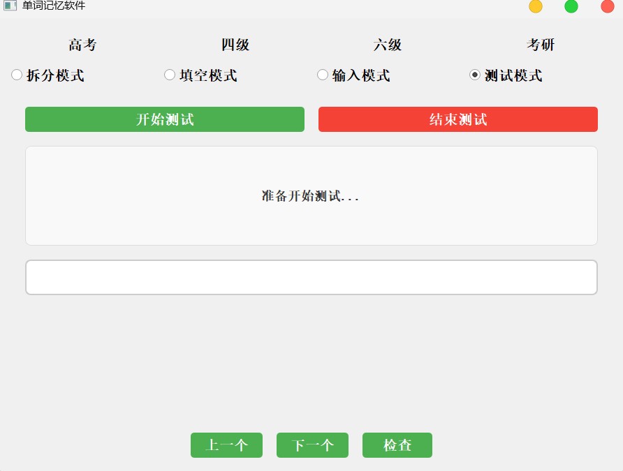 该代码实现了一个基于pyqt5的单词记忆软件,支持高考、四级、六级和考研四个级别的词库。程序提供四种学习模式:拆分模式(将单词拆分为片段重组)、填空模式(选择正确字母填空)、输入模式(手动输入单词)和测试模式(评估单词记忆效果)。软件界面包含单词释义显示、交互练习区域和反馈功能,支持单词级别切换、结果统计和保存功能。采用随机算法打乱单词顺序,确保学习效果,具有错误提示和自动跳转下一题功能,适合不同英语水平的学习者使用。