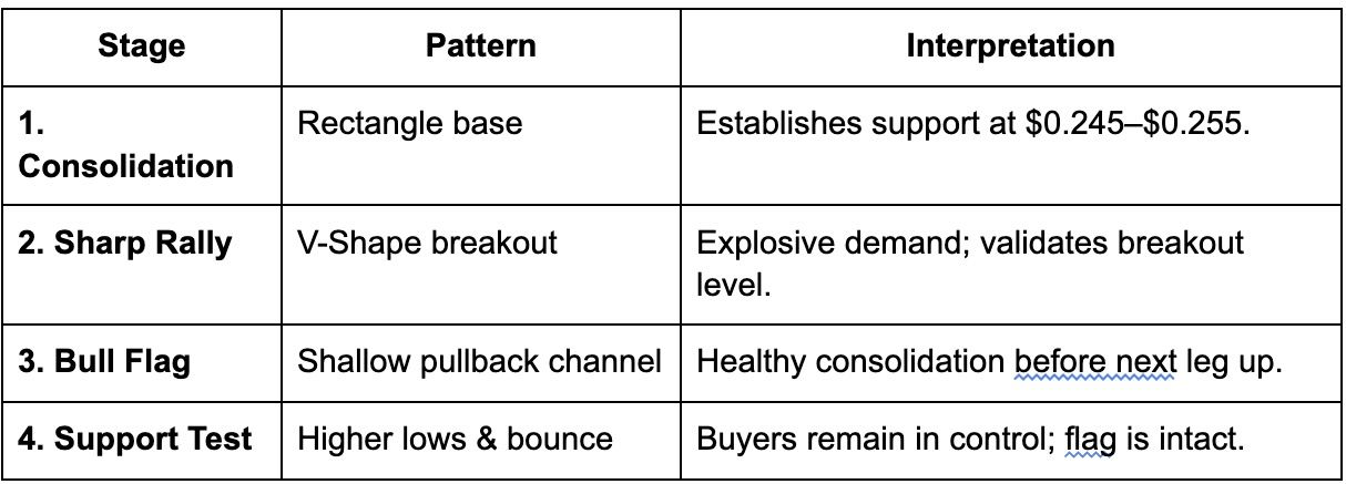 - 二次测试:价格重新测试旗形支撑位(约$0.275)并保持住,确认买家兴趣。