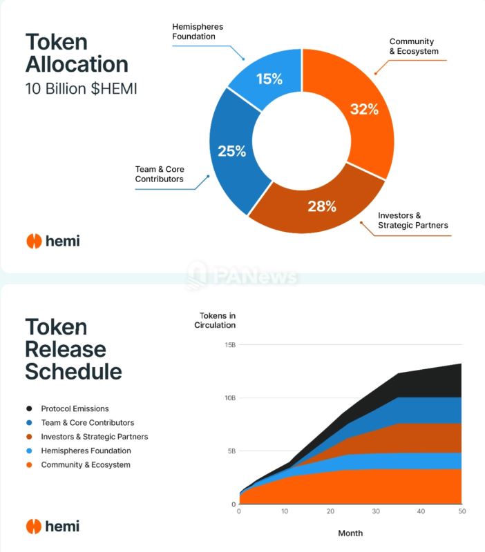 hemi 代币总量为 100 亿枚,其中 25%分配给团队及核心贡献者,15%用于 hemispheres 基金会,32%分配给社区及生态,28%分配给投资人及战略伙伴。