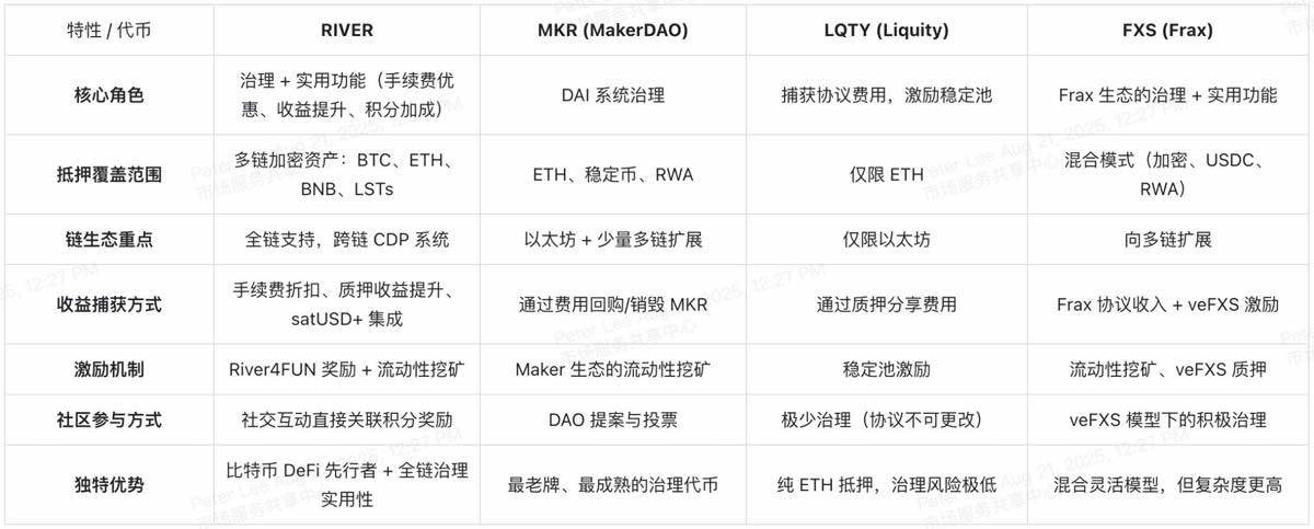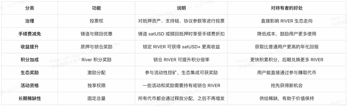 - – river:不仅有治理权,还提供手续费折扣、质押收益提升、river 积分加成,同时具备全链扩展和比特币抵押支持。