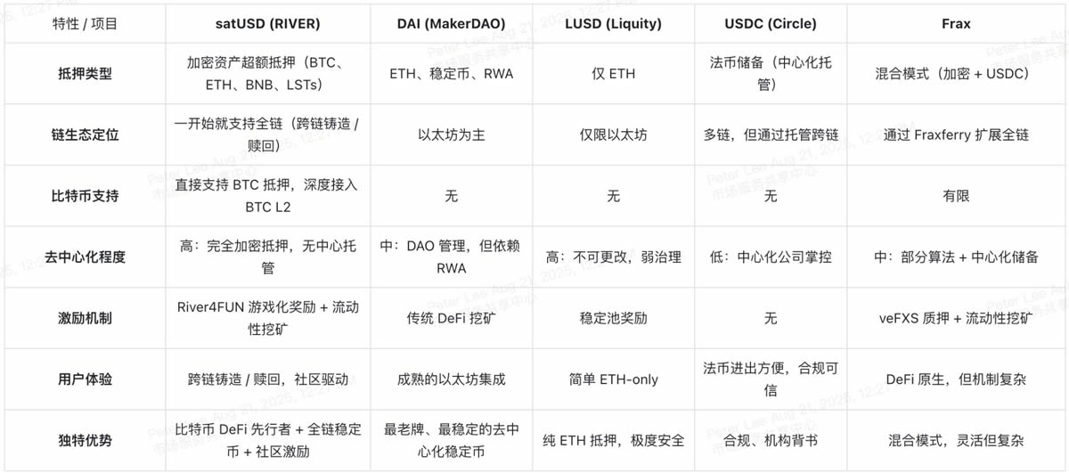 river 还与 usdc 和 frax 形成差异化。虽然这两个项目也在探索跨链,但依旧依赖中心化资产或包装代币。相比之下,satusd 完全由加密资产超额抵押,更加贴近去中心化的理念。