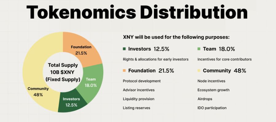 代币经济学简单明了,旨在实现长期利益一致,总供应量为100亿xny,并设有解锁计划以防止抛售。
