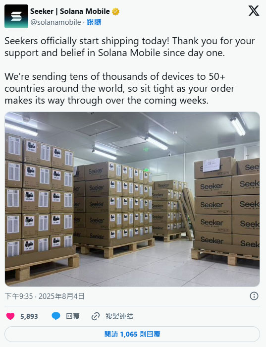 2025 年8 月4 日,solana mobile 正式宣布第二代web3 智慧型手机seeker出货,这款被许多社群称为「solana 手机二代」的装置,将运往全球超过50 个国家,包括台湾在内的地区也能收到货。
