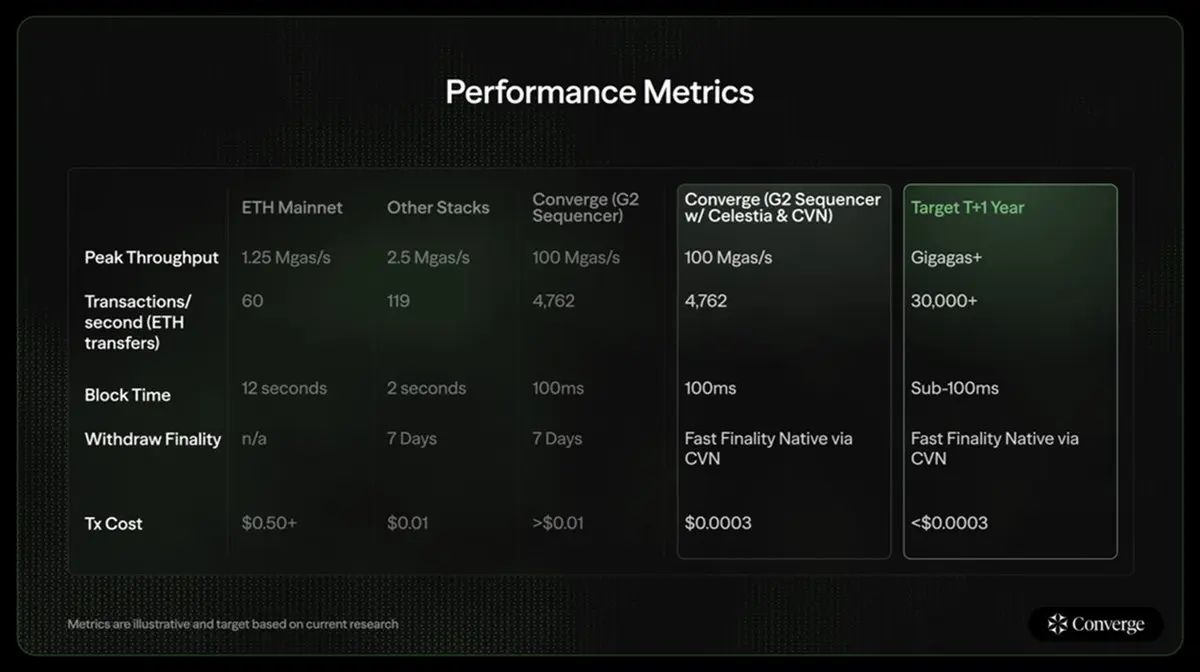 - 核心技术:执行层使用arbitrum,资料可用性由celestia 提供。采用conduit 驱动的自定义g2 排序器,区块时间目标为100 毫秒,并计划实现gigagas+ 吞吐。