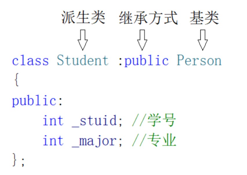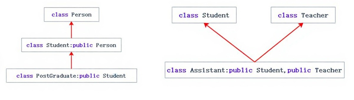 class 基类1 { ... }; class 基类2 { ... }; class 派生类 : 继承方式 基类1, 继承方式 基类2, ... { // 派生类成员 };