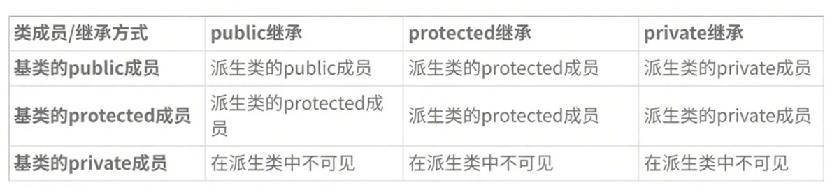 实际上面的表格我们总结一下就会发现,基类的私有成员在派生类中都是不可见的。基类的其他成员在派生类中的访问方式==min(成员在基类的访问限定符,继承方式)public>protected>private。