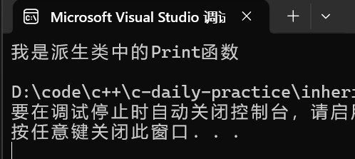 class person { public: void print() { cout << "我是基类中的print函数" << endl; } }; class student : public person { public: void print() { cout <<"我是派生类中的print函数" << endl; } }; int main() { student s1; s1.print(); return 0; };