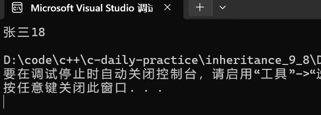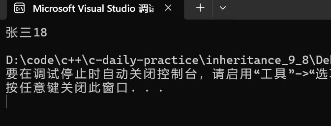 class a { public: //这里基类没有默认构造函数需要传递参数 a(string _name) { name = _name; } string name; }; class b : public a { public: //派生类中需要显式调用基类构造函数初始化基类的成员变量 b(int _n1,string _name) :a(_name) ,n1(_n1) {} void print() { cout << name << n1 << std::endl; } private: int n1; }; int main() { b ss(18,"张三"); ss.print(); return 0; };