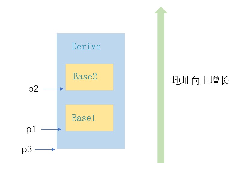 class base1 { public: int _b1; }; class base2 { public: int _b2; }; class derive : public base1, public base2 { public: int _d; }; int main() { derive d; base1* p1 = &d; base2* p2 = &d; derive* p3 = &d; return 0; }