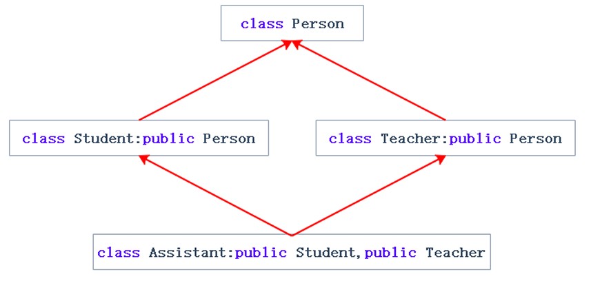 在这里student类与teacher类同时继承了person类,此时assistant又同时继承了student类与teacher类,这时会导致person类中的成员在assistant类中出现两次。当我们访问这类成员时编译器不知道我们访问的是student中person类的成员还是teacher中person类的成员: