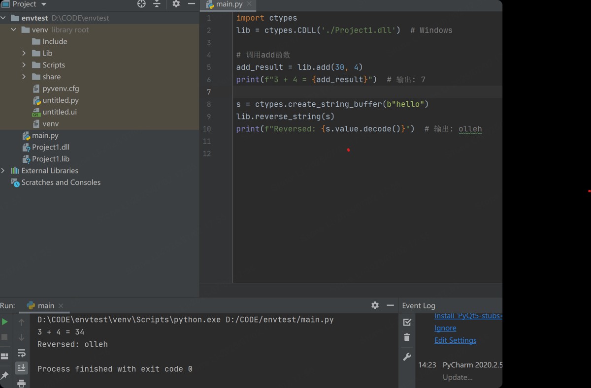 import ctypes # 加载动态库 lib = ctypes.cdll('./example.so') # linux/macos # lib = ctypes.cdll('./example.dll') # windows # 调用add函数 add_result = lib.add(3, 4) print(f"3 + 4 = {add_result}") # 输出: 7 # 调用reverse_string函数 # 注意:需要传递可变的字节数组 s = ctypes.create_string_buffer(b"hello") lib.reverse_string(s) print(f"reversed: {s.value.decode()}") # 输出: olleh