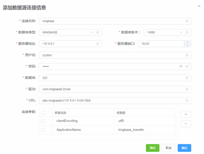 创建目标数据库连接。创建数据库连接界面如下,填写数据源信息,包括:“连接名称”、“数据