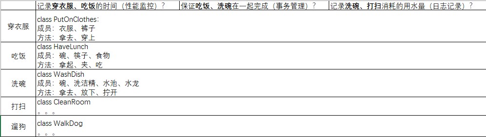 面向对象编程opp完成了穿衣、吃饭、洗碗等这些功能,但从另一个维度去控制这些功能,比如“查看穿衣服、吃饭的时间(性能监控)”、“保证吃饭、洗碗连在一起完成(事务管理)”、“记录洗碗、打扫消耗的用水量(日志记录)”这些就是面向切面编程aop