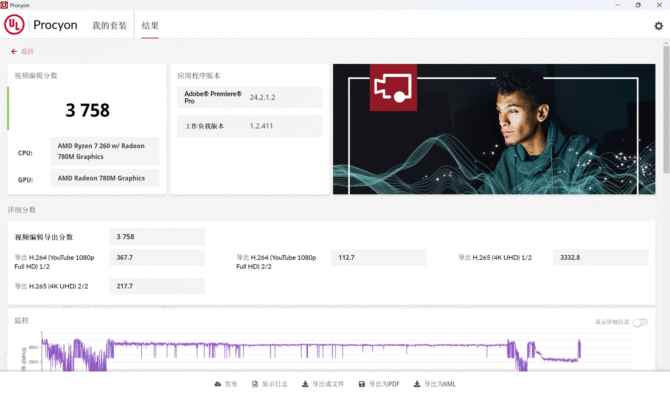为验证其实际表现,我们采用 procyon 视频剪辑基准测试进行专业评估,该测试通过调用行业主流的 adobe premiere pro 软件,模拟真实剪辑场景中的素材加载、时间线预览、效果添加及导出等核心流程。最终测试得分为 3758 分,这一成绩在同级别轻薄本中处于上游水平,对于自媒体创作者、职场内容制作者等用户群体而言,这样的表现完全能满足日常需求 —— 无论是制作产品宣传短片、会议记录剪辑,还是个人 vlog 创作,无需依赖笨重的高性能工作站,仅凭这台重量不足 1kg 的轻薄本就能高效完成从素材剪辑到成品导出的全流程,真正实现 “轻装创作” 的使用体验。