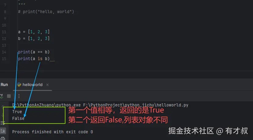 上面的例子很符合直觉对吧?a和b虽然是两个不同的列表,但内容完全一样,所以 ==