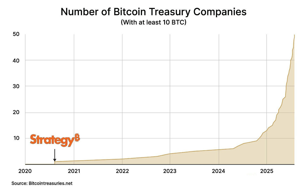 而且这些公司并非只在美国。事实上,比特币财库公司的现象几乎在一夜之间就成为了一场全球性的游戏。几乎在每个市场都有上市公司持续将其本地货币兑换成这种数字形式的稳健货币。