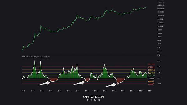 在过去的周期中,熊市低点通常对应于-2标准差线,偶尔在极端恐慌时刻(如2022年ftx崩盘)会触及-3标准差线。