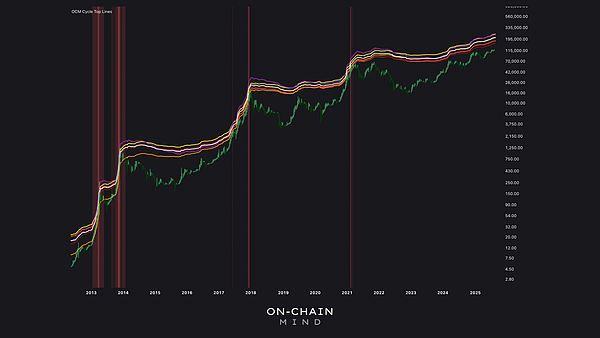 我的一个综合指标被称为“周期顶部线”,它整合了 6 个不同的链上指标,这些指标在历史上都曾标记出比特币的狂热峰值。虽然没有模型是完美的,但它们的合并平均值表明,此轮周期的顶部可能在约 211, 000 美元左右。