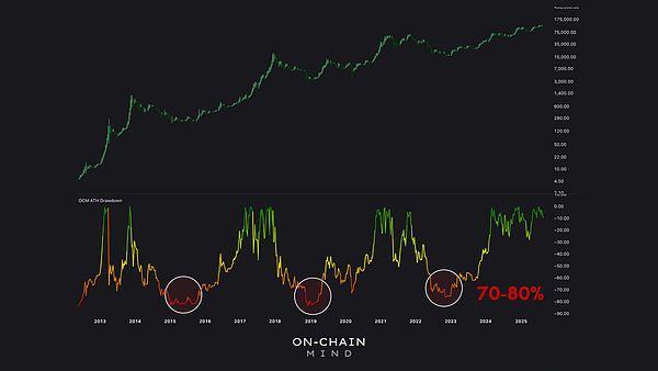 - 从历史上看,在之前的每次熊市中,比特币都会从历史高点回调70%-80% 。