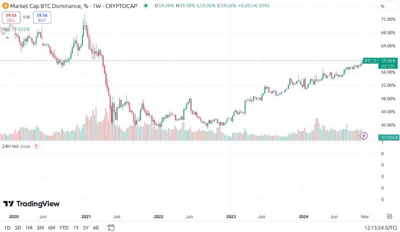 像 2022 年底至 2024 年那样的强劲比特币上涨,通常都伴随着比特币主导地位的提升。然而,2021 年 btc 的高点却是个例外。许多交易员将比特币的主导地位作为市场趋势是偏向山寨币还是背离山寨币的指标。