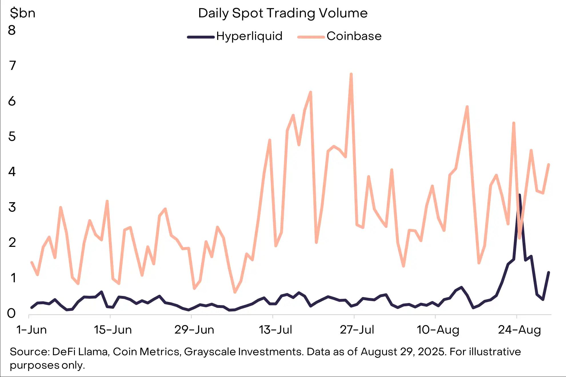 部分戏剧性事件发生在 hyperliquid,这是一家提供现货交易和永续合约的去中心化交易所(dex)(背景信息请参阅《dex 的吸引力:去中心化交易所的崛起》)。从 8 月 20 日开始,一位比特币「大鲸」(持有大量 btc 的投资者)抛售了约 35 亿美元的 btc,并立即购买了约 34 亿美元的 eth。[6] 虽然我们无法推测这位投资者的动机,但这种规模的风险转移发生在 dex 而非中心化交易所(cex)是一种令人鼓舞的现象。事实上,在当月交易量最大的那一天,hyperliquid 的现货交易量一度超过 coinbase 的现货交易量(见图 3)。
