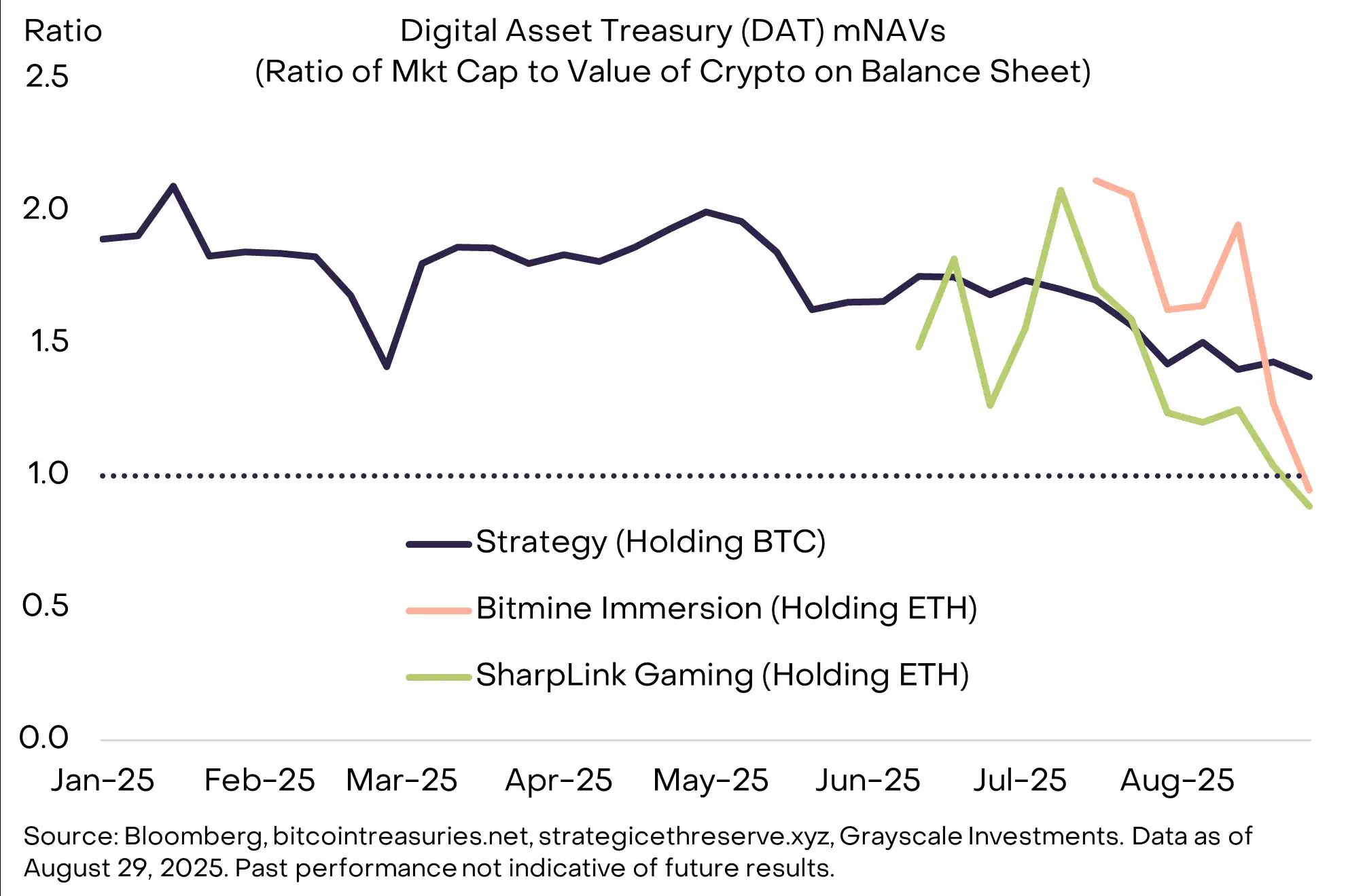 · 数字资产财库(dat)——在资产负债表上持有加密货币的上市公司——近几个月来激增,但投资者需求可能已趋于饱和。大型项目的估值溢价正在压缩。