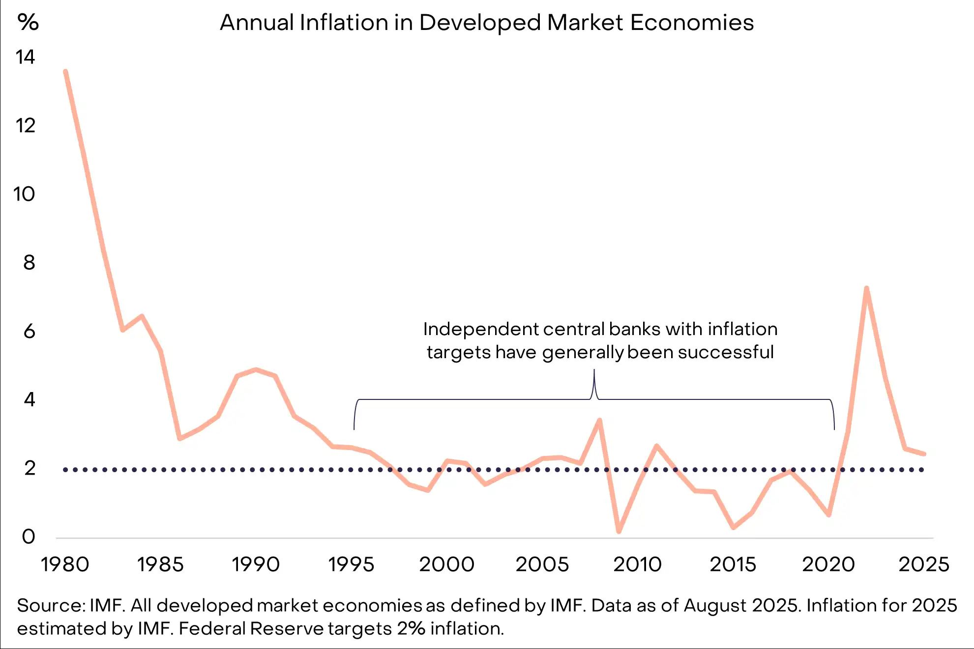 因此,为了让法定货币有效运作,需要确保政府能够履行承诺,不滥用这一体系。美国和大多数发达市场经济体采用的方法是赋予央行明确的目标(通常以通胀目标的形式)和操作独立性。民选官员通常对央行进行一些监督,以确保民主问责。除了新冠疫情后通胀短暂飙升外,自 1990 年代中期以来,这种明确的目标、操作独立性和民主问责体系在主要经济体实现了低通胀和稳定通胀(图 6)。
