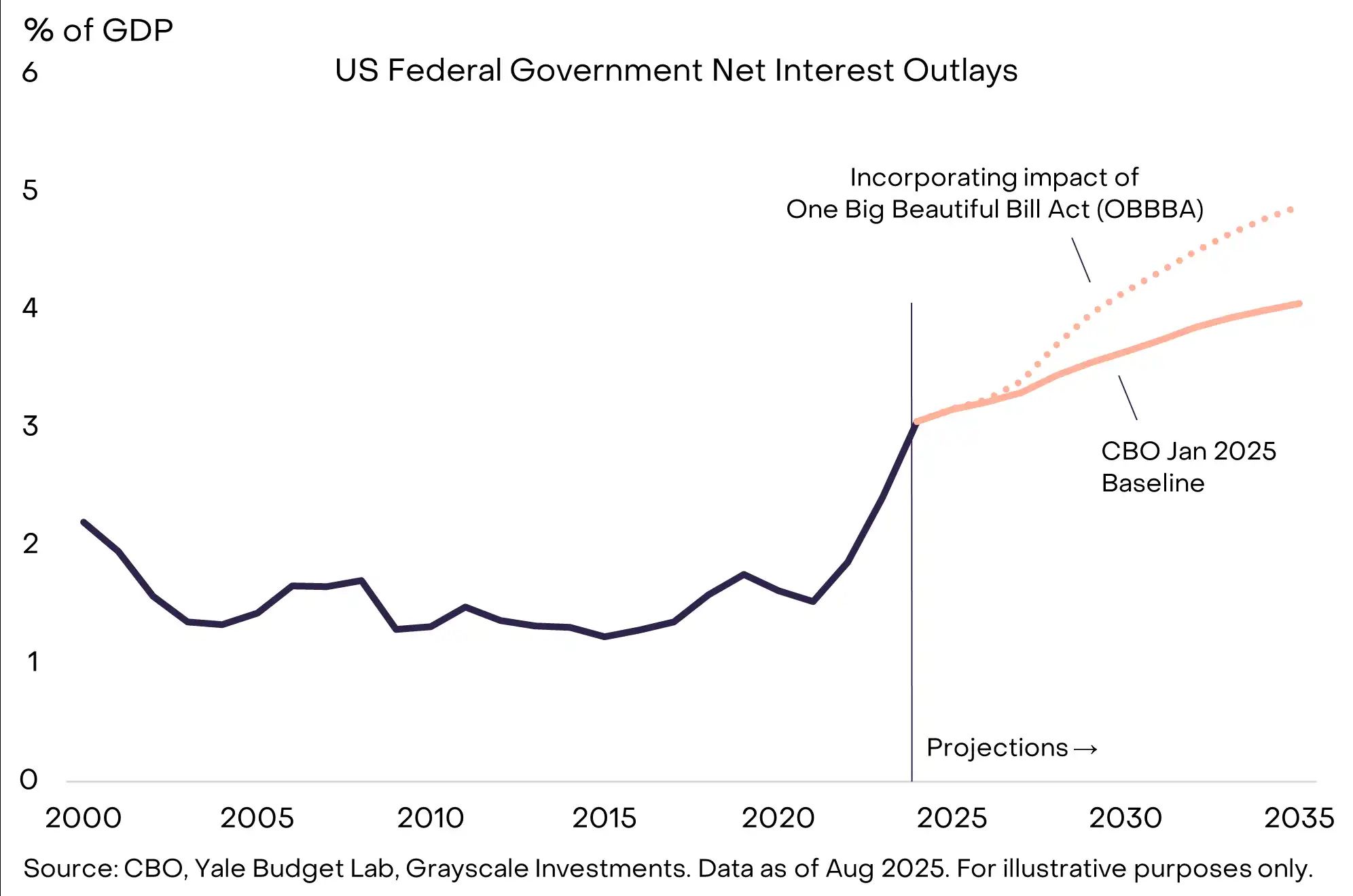今年 7 月通过的《大而美法案》(one big beautiful bill act,obbba)将锁定未来 10 年的高赤字。除非利率下降,否则这将意味着更高的利息支出,并进一步挤压政府收入的其他用途。结果是,白宫多次施压美联储降低利率,并要求美联储主席鲍威尔辞职。8 月份,随着美联储七人理事会六名现任成员之一丽莎·库克被罢免,这些对美联储独立性的威胁进一步升级。[11] 虽然短期内可能对民选官员有利,但美联储独立性的削弱在长期内会增加高通胀和货币疲软的风险。