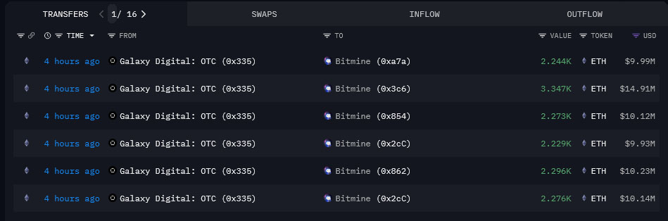 据区块链分析平台arkham intelligence数据显示,bitmine通过galaxy digital的场外交易 台 完 成六笔交易以完成此次收购。