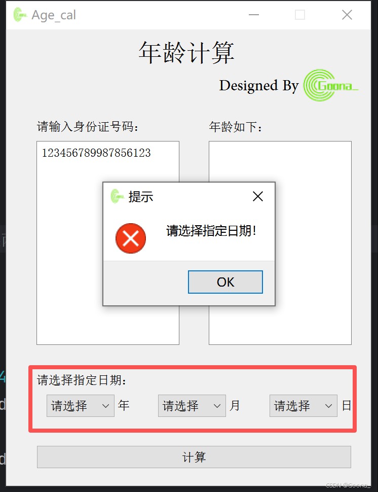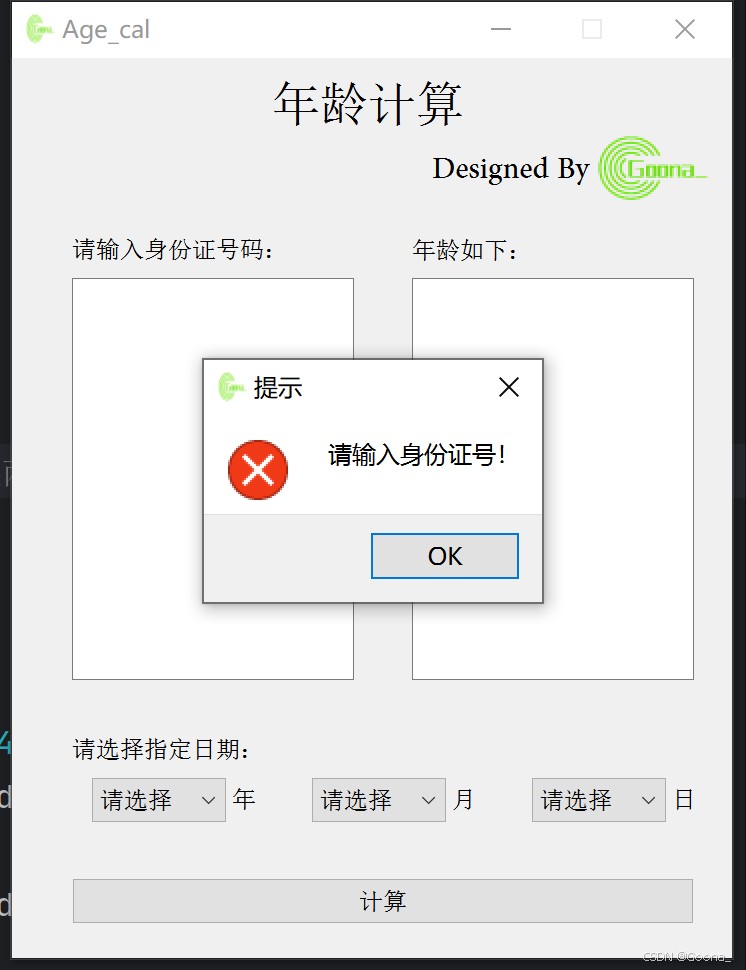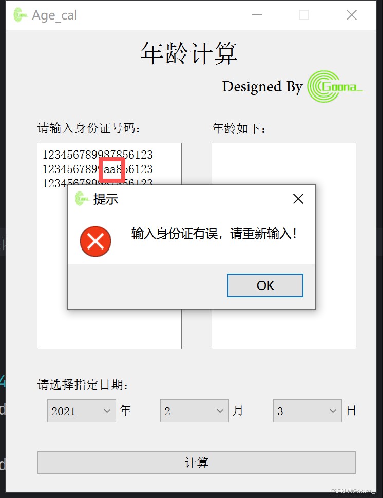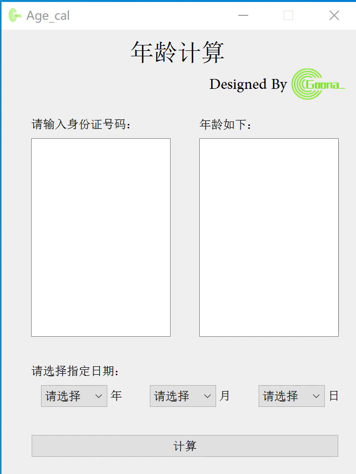 初始界面搭建采用极简风格。当批量输入(也可直接从excel中复制粘贴)合法的身份证号码后,若其合法,点击“计算”后会在右侧给出对应年龄(周岁)结果;否则,会告知用户输入身份证号码存在不合法项并提示重新输入。