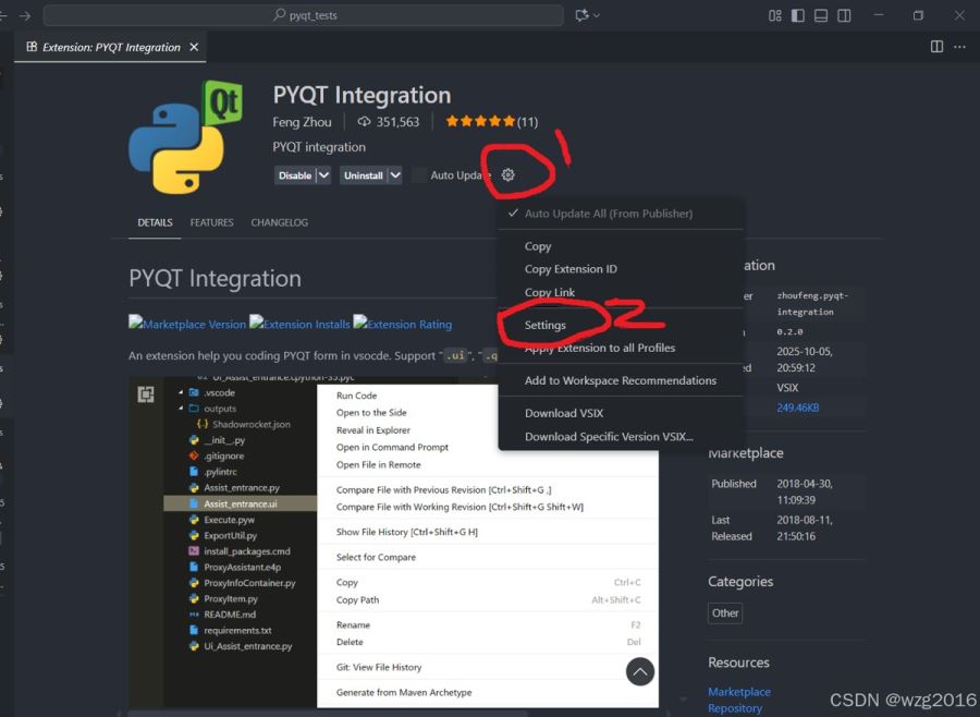 给 vscode 安装插件 “pyqt integration”,点击 “pyqt integration” 插件界面的齿轮,选择“settings”,进入该插件的设置页面: