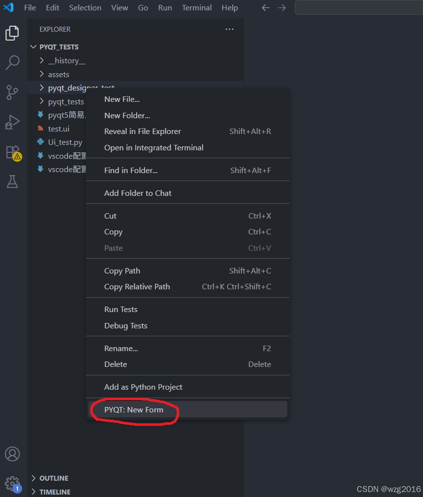 在 vscode 的文件目录下,点击鼠标右键,选择“pyqt:new form”, 创建 qt 的 ui 界面,自动调用qt-designer打开