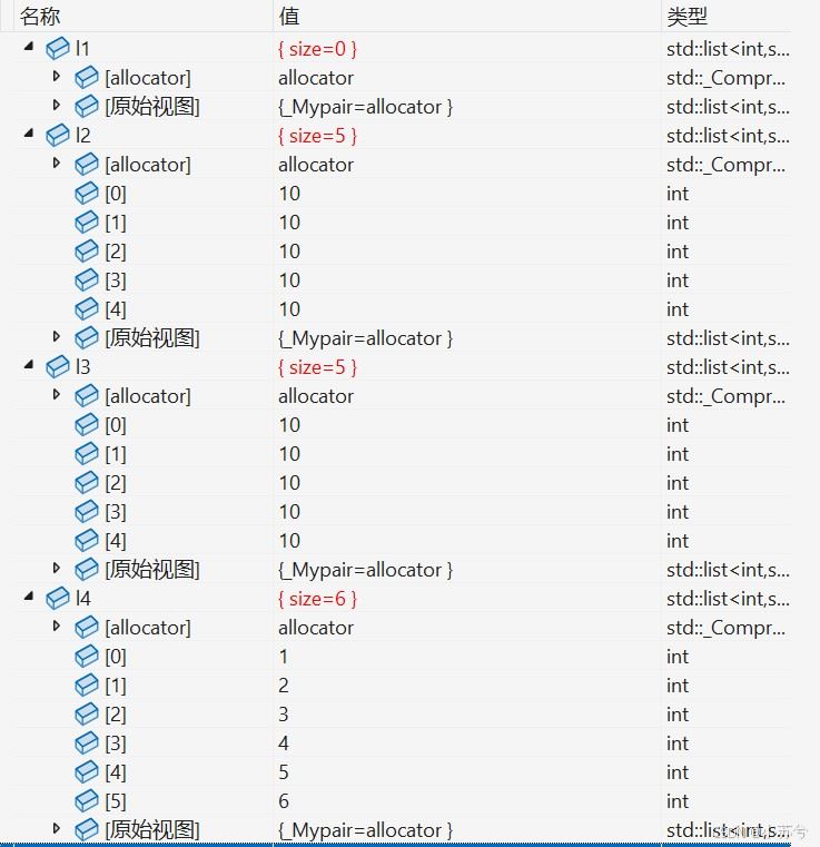 list<int> l4(v.begin(), v.end());//用迭代器区间来初始化