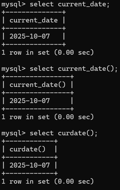 • current_date和 current_date() 是 curdate() 的同义词⽤于获取当前⽇期