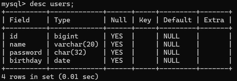year[(4)] | 1byte | • 4位格式的年份 • ⽀持范围 1901 ~ 2155 • 显⽰格式为 yyyy • 0值为 0 | 0 |