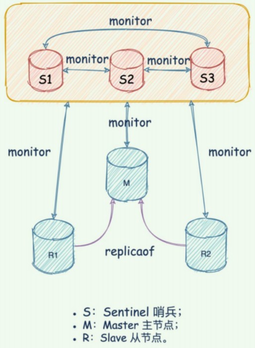 哨兵最基础架构由两部分组成,包括哨兵节点和数据节点。