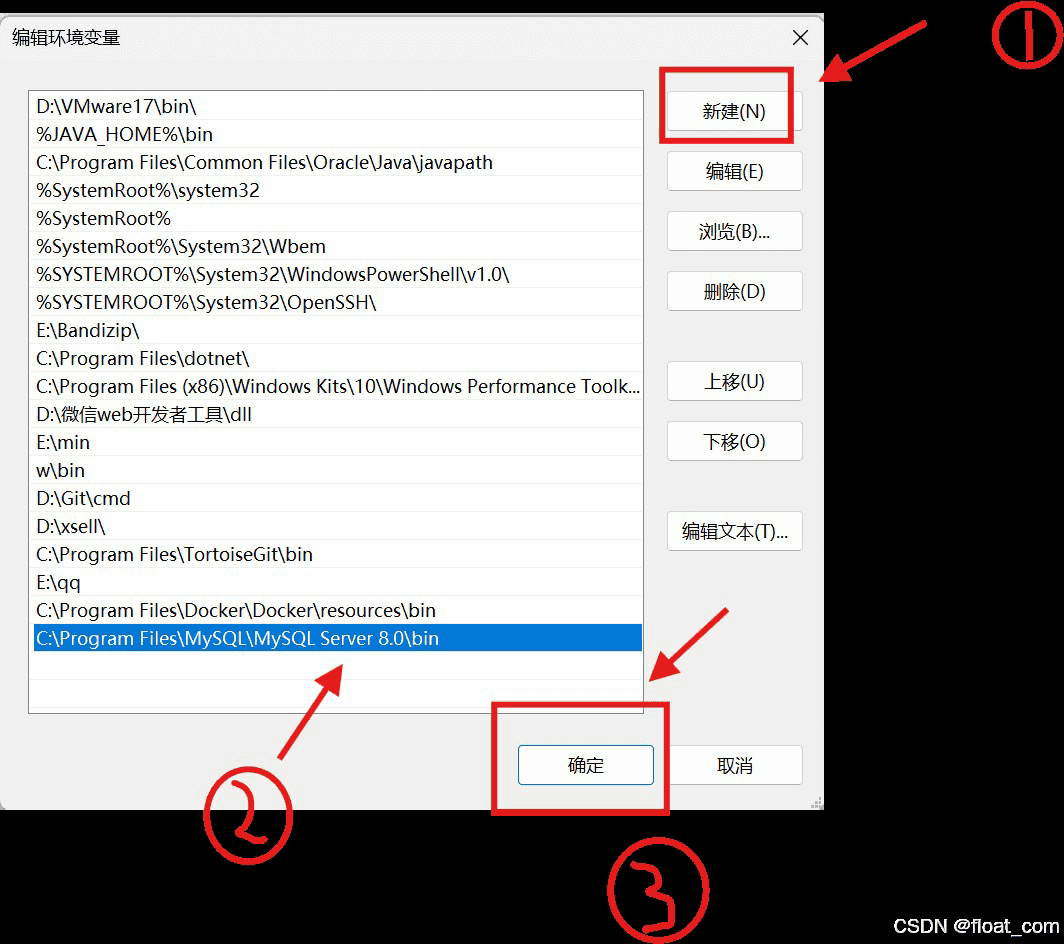 找到path,点击编辑,新建,将下载的mysql中的bin目录的路径添加至此