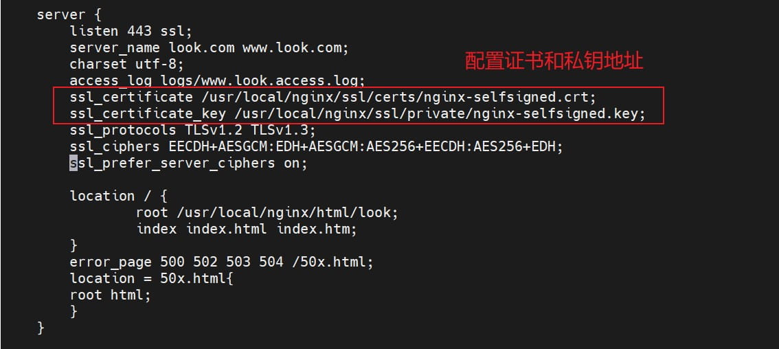 证书应该已经保存在 /usr/local/nginx/ssl/certs/nginx-selfsigned.crt(自签名证书),密钥文件保存在 /usr/local/nginx/ssl/private/nginx-selfsigned.key`(私钥文件)。在nginx去配置引导这两个文件